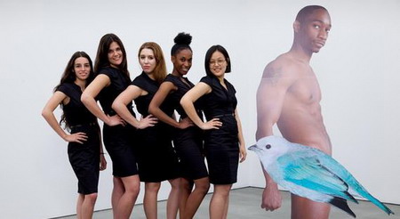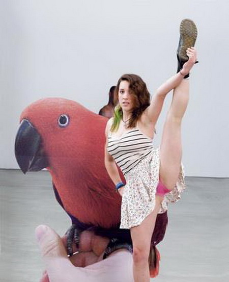 DIS的在线项目“Competing Images: Art vs. People”(2012),一个模特在艺术家Katja Novitskova的作品“Innate Disposition”(2012)前劈叉。
