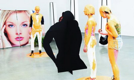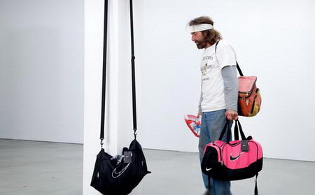 不过这场展览也不是毫无可取之处。Agatha Wara邀请到了DIS团队来博物馆里拍照——在线杂志DIS将艺术视为一种生活方式的品牌,将时尚照片视为概念艺术的一种形式。社会关系与富有创造性的合作将DIS与“后网络艺术”联系到了一起。Timur Si-Qin甚至将文章发表到了DIS的图片库里。“后网络艺术”通常偏爱用可以预测的植物作为生命的象征,而与自己作为一本生活杂志的使命保持一致步调的DIS则不断提出关于人类需要如何扭曲才能适应或无法适应的问题。在DIS为那场展览拍摄的照片中有一张相当典型(该项目被命名为“Competing Images: Art vs. People”):一群肤色各异的模特排成一排站在Katja Novitskova的纸板雕塑作品旁,雕塑的平面性在真实人体的立体性下显得黯然失色。在另一张照片中,一个空空的Nike包软绵绵地挂在柱子上,旁边站着一个邋遢的、目光向下的男人,手中还提着一个看起来装着东西的Nike包。