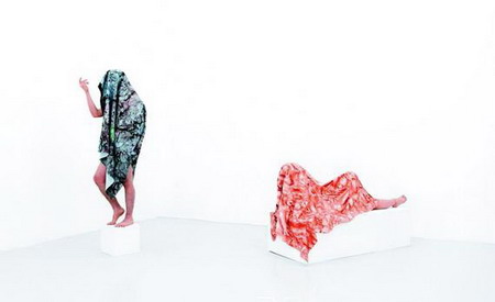 DIS的在线项目“Competing Images”(2012),浑身涂满颜料的模特与Katja Novitskova的雕塑,挂着的包是Timur Si-Qin的作品。