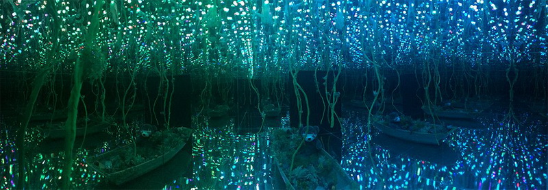 这件作品是根据美术馆的空间结构特点来具体创作的,为了不破坏原有墙面,在展厅中搭建了一个镜子盒子。屋顶倒挂着7个原始的野人,空中飞着一群信鸽,悬挂数条藤蔓,地面停滞一条长满青苔杂草的木船。展厅中循环播放着教堂里常常放的两首歌:Koreansk folkmelodi:Lullaby 和Fansk julsang:ll Est Ne Le Divin Enfant。屋顶下挂78盏高高低低的LED灯,它们像呼吸一样伴随着音乐缓缓变化不同颜色。作品名称概括了作品中的几个部分,像诗集一样把它们放在一起。