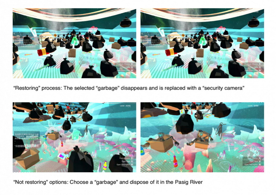 《未来_预报》通过一家虚构的未来互联网服务供应商和区块链公司的视角,和其所在的网络生态、地缘政治和社会文化的影响,呈现并预测以菲律宾为代表的发展中国家的云网络社会的演变。项目包括一个实时模拟+集体创世网络环境,一系列NFT角色设计和一个CGI影像(《巴石河2030 – 6 Plus》)。在集体创世网络环境的部分,艺术家设置了一系列基于前期调研的任务,玩家在成功完成任务后可进行“建设“并永久地改变此项目的地貌。同时,每一个任务都包含了两个选项,而每个选项都包含了优点和缺点。参与者可以根据自己认为正确的未来发展方向进行选择,共同创造一个未来的“菲律宾”。