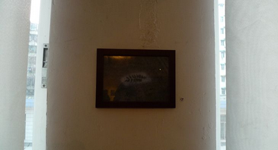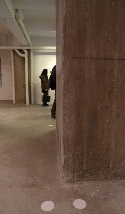 一幅炭笔画,《画两个完全相同的圆形,一个给左眼、一个给右眼》,“它令我联想起顾城的诗:黑夜给了我黑色的眼睛/我却用它寻找光明”(艺术家语)。这幅画挂在维他命空间临时为白双全搭建的工作室外墙上,是艺术家去年提交的一个方案《双()城记》的一半,原计划分广州和斯德哥尔摩两部分,现在呈现出来的仅仅是广州的空房间。原方案写道:“作品探索私人空间和城市公共空间的关系;再深一层是探索人自我世界的空间和外在环境的关系,因为房子的样子就是人內心世界的投射。”