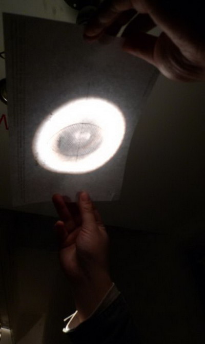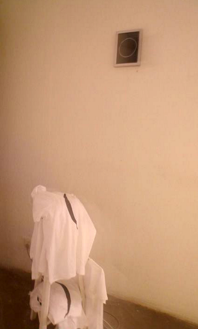 在北方看惯“大作”,初步入展厅,不免讶异:“作品怎么这样少且这样小?”展览是由十八件作品和一个工作室构成的。门口,两盏射灯在地面打出的展览请柬图案,两个交错的圆形。手持一张作品目录,在现场按图索骥,像玩寻宝游戏。每件作品旁边都贴有对应的编号。不瞟这张纸,好几件作品一定找不着。
