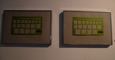 墙角是一台面壁的电视机,只看见荧荧的光边不断跳动,煞是好看,里面循环播放的翻版日本AV可窥不到一星半点。是为装置《四方的光》。旁边,就是《你从来都没有看过(真正的)正方形》,展示的是两个绘图尺。意思是“从不同的角度看四方形,它都会因你身处的位置而‘变形’”(艺术家语)。我记得有朋友讲过,他小时候家里客厅是狭长的,一边吃饭一边看电视,电视屏幕是不一样的。