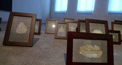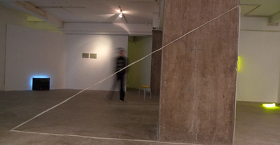 左边第一件是《关于绘画的概念》和《无题》,地面上摆放的若干相框装裱的是纽约街头拾得的落叶,对应墙上一帧小照片,拿走树叶前,用白色喷漆留在水泥路面上的形状。(《纽约记忆》)落叶相框一旁的地面上,用粉笔画绘的四条线,是艺术家在钻石山坟场找到的四个人的生命线,最上的三条线是一家人,他们的长度彼此包含。“儿子活在母亲的生命里,母亲活在父亲的生命里。(艺术家语)”而他们的痕迹必在我们的来回走动中,重归于无。