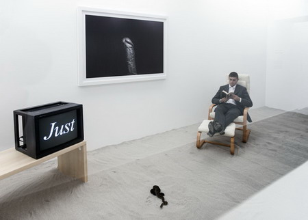 2012, sand, bench, single channel digital video (b/w, silent), 21-inch monitor, snake, photography, Armchair and footstool, actors, voice, dimensions variable
