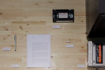 2012/行为,录像装置(VHS磁带,17英寸监视器,松下AG-6400磁带录像机,文稿,笔,烟头,标签,玻璃表面,工作台,折叠椅)/尺寸可变