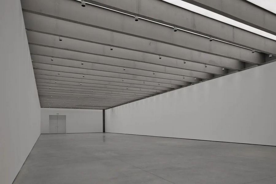 新建造的两个展厅都采用无柱大跨现浇混凝士结构,一个是采用巨大的倒拱式曲面横梁,另一个是混凝士密肋式大跨橫梁结构体系。美术馆中间有14米高有着自然天光的垂直竖向的立方柱体空间,它像一个光井,直接插在建筑最深、暗的部位。