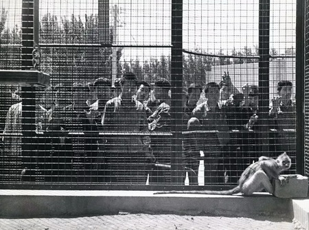 (一幅从笼内角度拍摄的游客观看猴子的照片)