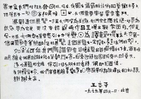 “屋里光线很暗,墙上挂满了照片,他们正在自己办一个影展;房主池小宁是个黑黝黝,脏兮兮,头发乱蓬蓬的大孩子;一个中年人埋坐在沙发里,并没有因为我们进来而起身;另外几个小伙子脸上的气氛似乎也看不出轻松和友善。我们没多说什么,在他们目光的注视下,屏住呼吸仔细地观看了这些照片:有些很有些想法和技巧,但他们毕竟岁数小,有些作品看来还是“ 嫩”了一些。我们心里有数了,这才将想邀请他们和我们一起办影展的来意说明。