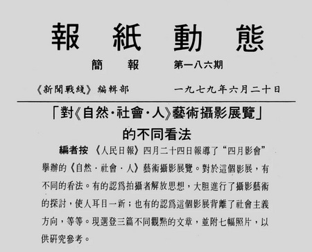 写这篇报道的记者王永安回忆:“1979年4月21日,当时任《人民日报》总编辑的秦川同志把我叫到他的办公室,开门见山地说:‘昨天晚上,有位老同志给我打电话,说有一批年轻人在中山公园办了个《自然、社会、人》摄影展览,现在有人要批,搞的那些年轻人很紧张。你去看看,影展到底怎么样?”。于是第二天有了上述报道消息。两天后4月24日新华社的“国内动态清样”上出现一篇针锋相对观点的长文: