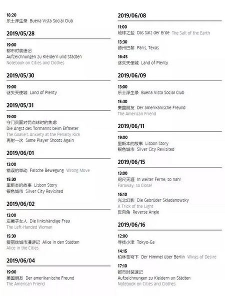 在此次电影专题回顾的框架下,北京德国文化中心·歌德学院(中国)和中国电影资料馆共将展映文德斯先生的21部影片,举办41场次放映,以介绍文德斯电影创作的全貌:从他的短片到聚焦20世纪70年代西德的批判现实作品,从典范性的公路电影、现代童话到涉猎广泛的纪录影片—— 这些作品多以呈现艺术创作过程和探讨影像创作为核心内容。