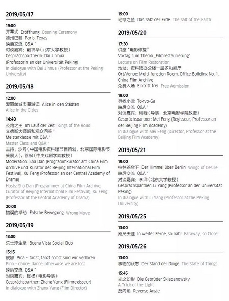 文德斯先生将出席《德州巴黎》(开幕影片,5月17日)、《皮娜》(5月19日)、《寻找小津》(5月20日)和《柏林苍穹下》(5月21日)的映后谈,分别与中国导演张杨、梅峰以及电影学者戴锦华和李洋对话。于5月18日举办的大师班活动中,文德斯将向中国影迷敞开他的世界,讲述他的工作与生活。该活动由中国电影资料馆节目策划沙丹和中央戏剧学院教授徐枫主持。此外,文德斯先生将于5月19日举办讲座,介绍于2012年成立的文德斯基金会对他电影的存档和修复工作,并与中国电影资料馆的相关专家进行交流。