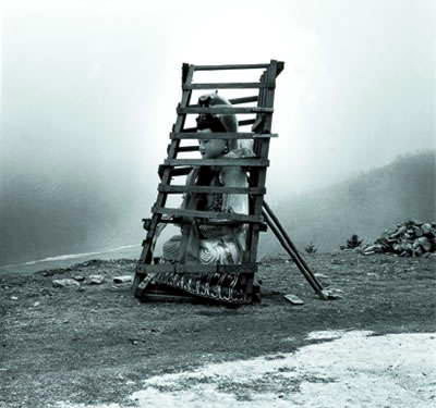照相机镜头作为艺术的直接观众,在九十年代前中期的行为、装置艺术中承担着观看者和记录者的双重角色。之所以强调“观看者”的角色,是因为此时的照相机已经不仅仅是躲在角落里“抓拍”艺术过程的一个无名观众,在很大程度上,它成为艺术家面对的唯一欣赏者,行为表演以最佳的位置和角度呈现在镜头面前。1995年,摄影师吕楠拍摄了北京“东村”艺术家集体创作的行为艺术作品《为无名山增高一米》。这张照片以第一观众的身份记录了这次集体的行为艺术,使这次短暂的艺术行为得以通过图片传播开来。荣荣和邢丹文在九十年代中后期,开始有意识地以摄影为媒介进行艺术创作,“东村”的其他一些艺术家也在近年越来越关注摄影和艺术的融合。