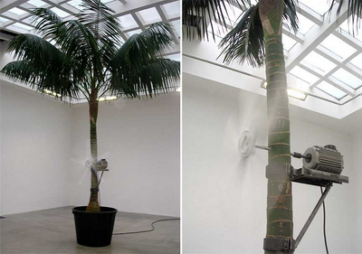 Palm tree, fan, and motor, approximately 30 x 9 feet in diameter. Installation view: Galerie Chantal Crousel, Paris.
