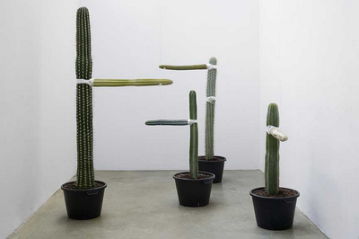 Plant grafts, variable dimensions. Left to right: Pathycerus pecto-abrigine and Pachycereus Pringlei; Marginato cergus marginatus and Pilosocerens; Tricho Cereus Hertringinnis, Pilosocerens azureus, and Wetoerocereus yohnstonii; Isocato cereus pumortgrii and Pilosocereus hu. Installation view: "Entropics", Galerie Chantal Crousel, Paris.