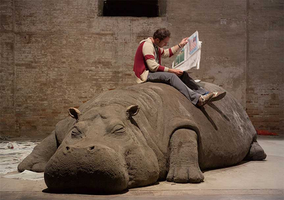 Mud, whistle, daily newspaper, and live person, approximately 16 x 6 x 5 feet. Installation view: 51st Venice Biennale.