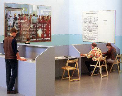 伊利亚·卡巴科夫记录性的装置作品是前苏联生活再现,他让这些曾经是美好的乌托邦的世界在三维甚至加入时间的四维空间中