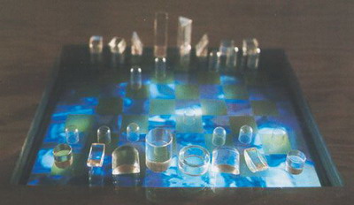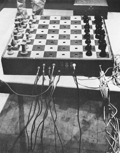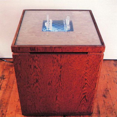 最终的成品,《录像棋》(Video Chess)制作于1968-75年,是个电视雕塑,一个装在木箱里显示屏朝上的装置。屏幕上放置着透明的棋盘和棋子,杜尚和凯奇的那盘棋被转换成影像,伴随1968年下棋现场的原声,再现了两位大师的较量。