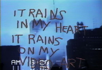 一部有关雨水摧毁了久保田成子和白南准工作室的录像,由于不负责任的屋顶承包商他们的工作室遭遇了大水,损坏了多部无法估计的录像作品和设备。屏幕上显示着白南准难懂的叙事手法,他们过去的工作室图像穿插在其中,“雨下在我心中,雨下在我的录像作品上...艺术模仿自然,自然模仿艺术。”,久保田成子。