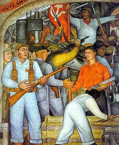 狄亚哥的壁画《军械库》(El Arsenal, 1928)中有正在分发枪械的弗里达。