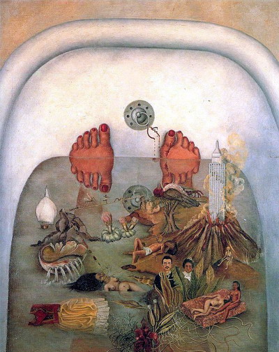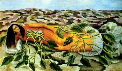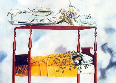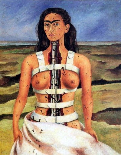 自此Frida着手于一系列历史上从未有过的艺术形式的创作,它们庄严地表现着女性真实、现实、残忍、苦楚的品质。以前还从来没有人像Frida一样将如此痛楚的诗歌写在油画的画布上。她有整整一年躺在床上一动不能动。在此期间,她就穿着由皮革、石膏和钢丝做成的支撑脊椎的胸衣。生命暗淡到极处时,她从自己的艺术创作中找到了安慰。