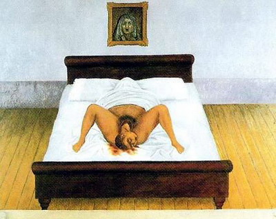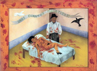 《少少掐个几小下》(Unos Cuantos Piquetitos, 1935)狄亚哥说弗里达“是艺术史上第一个女人,以全然鲁莽的真诚以及安静的残忍,在她的艺术里潜心钻研常见的,却独特的,仅仅关于女人的主题。”