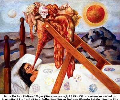 她的健康从来就没有特别好过,1944年以后明显更差了。她开始接受众多脊骨与跛脚的手术。研究她生平与作品的权威人士怀疑是否这些手术都是必要的,或者它们只是吸引Rivera注意的手段。对Frida而言,她生理上与心理上的痛苦总是联系在一起的。50年代早期,她出现病情危机住进墨西哥城的医院,在那呆了一年。