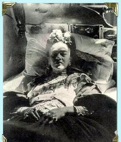 同年,Frida受到组织坏死的威胁,对右腿膝关节以下进行了截肢,这对于一个精心营造自我形象的人来说无疑是个致命打击。她尝试着用假腿走路,甚至还在朋友的庆典上跳舞。但是终点临近了。1954年7月弗里达最后一次出现在公共场所,是在一次共产党的示威活动上。之后不久,她睡着了,再也没有醒来,在睡梦中死去,似乎是窒息而死。又据报导是血栓塞,却不排除自杀的可能。很多与她亲近的朋友都怀疑她是自杀。她在最后的日记上写着:“我希望死是令人愉快的,而且我希望永不再来。——Frida.” 却和她的最后一幅画《生活万岁》(Viva La Vida, 1954)不相矛盾。生活太痛,同时也太美。痛和美,同样要用身体和能量来承受。身体瓦解了,只能让灵魂飘走。