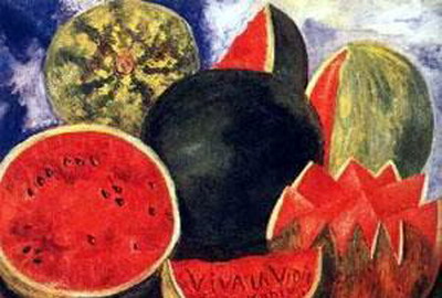 切开的西瓜看似熟透香甜,其中一片西瓜上写着大大的字:“生活万岁!”弗里达留给我们的,是不朽的精神和永恒的艺术。 弗里达的爱是超越性别的,弗里达的生命是超越生死的。弗里达的存在是超越时空的。