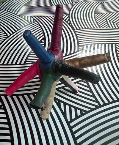 此外,我们可以发现近年来在吉姆·兰比的展览中伴随地板工程出现的还有各种生长出来的奇怪雕塑。例如Sonic Reducer(2008),是由沉放在一块不规则水泥块中的大量相纸叠覆而成,并被随意地分散安置。Warm Leatherette(2008)同样有着类似的感染力,且带富含幽默味道和偏向朋克的风格,这件多彩的夹克凸显袖子的线缝痕迹,同时把它垫起以展现一个直立多肢的皮毛生物,但是这本应丑陋的东西却让人感到一种奇异的美。吉姆·兰比指出了作品中彩带地板部分和生长出的雕塑之间的联系,它们暗指了爵士乐团:地板部分是“鼓和贝斯演奏的低音”而上半部分则是“吉他和声乐部演奏的高音”。