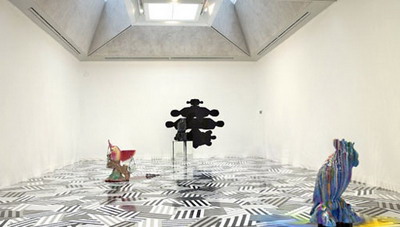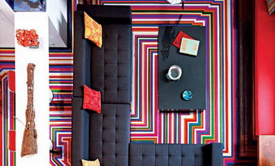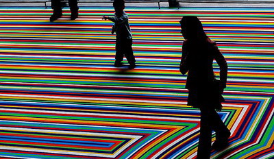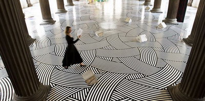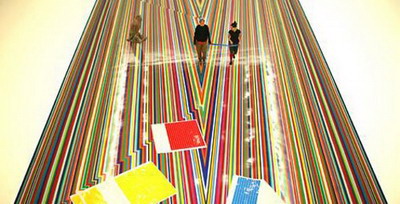 在吉姆·兰比的艺术实践中,其标志性符号是用色彩鲜艳或黑白相间的乙烯胶带布置美术馆场地地板的图案,追寻空间的形状去表现其结构的特色。