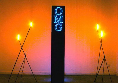 虽然艺术家本人并不常说“OMG”,但是这个词语在日常生活对话中无处不在。人们用“OMG”代表他们对事物的惊讶、怀疑、祈祷、讽刺等等情绪。这句话显得很日常,很平庸。也难怪Nik Kosmas这样评论这件作品:“对我们来说,这是一句很好的话…这是一种对平庸的纪念…一种对陈腐的东西的炒作… ”。从另一个方面来看,“OMG”被从上下文中取出,艺术家借用这个作品隐喻了一个当代社会。在那里电子技术既像“OMG”这句话那样无处不在,平庸到极点,但在某种程度上也像上帝一样被放在膜拜的地位。钢管支撑起的支架就像焚烧的香火一样立在方碑两侧,与中间的方碑结合在一起,使之既像是一种祭奠和仪式,又有着某种崇拜的含义。整个作品既是对在社会上所看到常态的模仿,又具有现实反讽意识。正如艺术家所说:“我们很希望真诚,但是当你真诚的时候,很容易被别人排斥。而讽刺是一种真诚的方式。”他们正是用这种讽刺的方式真诚地揭示着他们所看到的世界。