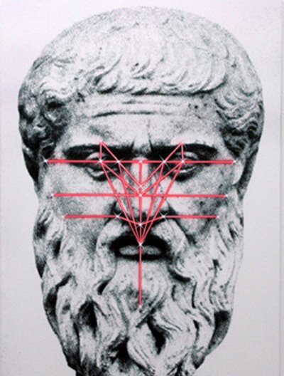 作品由两部分组成:油画布上以希腊传统的柏拉图雕像图片为背景,由单一的黑白两色构成,轮廓清晰分明。在雕像的面部,红色的镭射线精确地划分出了五官的位置和相关坐标,并在每条线的相交点上用闪烁的“星星“图形突出面部五官结构的重要构成点。