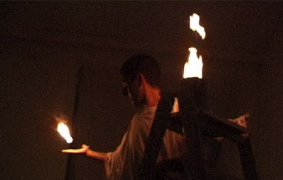 在作品中,艺术家没有描绘蜂群消失的过程,也没有采取直观地反复说教的方式来让观者认识到这个迫在眉睫的问题。在阴森恐怖的灯光下,一位艺术家通过一种仪式式的行为表演---用自制的装置反复吸大麻的行为,来传达给观者一种自我伤害和逃避现实的行为。另一位艺术家不断地点燃火,使室内空间持续升温,似在暗示着造成这一全球现象的原因所在。