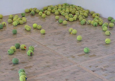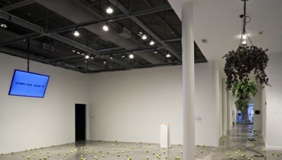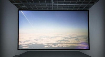 走进画廊,人们会发现刚刚所看到的“篮子”实际上是人造的常青藤,它们被悬挂在头顶的地方。这一系列作品名字叫“Sculptures Suspendues”,它们表现了“产品的人造暂时性的恶性循环”。“Parachute Dore”——也就是在门外看到的金黄色的降落伞——则表现了为犯过严重错误的商业人士所保留的奢华的条件。在旁边的展厅中,展出了一件双屏幕影像装置“Fighting Gravity Moscow-London,London-Moscow(2010)”,这是从一架私人喷气式飞机的驾驶员座舱中拍摄的云和天空,当时飞机是在伦敦和莫斯科之间往返飞行。这件作品表现了“远离地面时的恒定的危险”,这种“假想的天空”能使沉浸在其中的观众们联想起宁静的白云蓝天吗?“Suicide Stack”(2010)这与这件影像装置形成了鲜明的对比,它会使人感到不安。作品为我们呈现了正撞向奥斯丁IRS建筑的小型飞机中一位软件工程师的最后遗言。这件作品就像是一种致命的负重一样,故意而有效地中止了这次与重力做空想斗争的展览。
