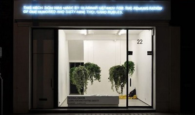 在伦敦Regina画廊的玻璃正门上,悬挂着一块霓虹灯的标记牌,上面写着“这快霓虹灯标记牌由Vladimir Ustinov制作,酬金总共16.9万卢布”。透过玻璃门,我们可以看到一排悬挂着的篮子缓慢地随着链条旋转。一个金黄色的降落伞从背包中散落出来,堆放在角落中,这使人联想起超级英雄。