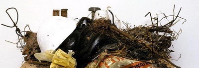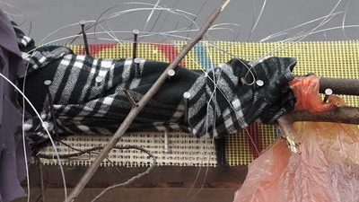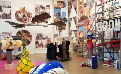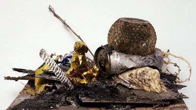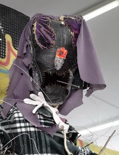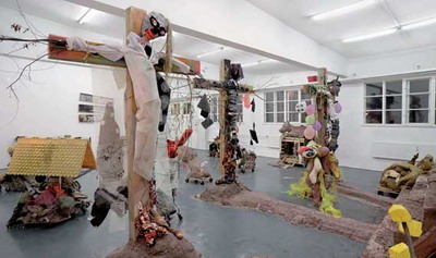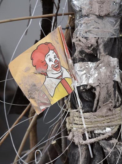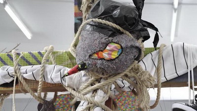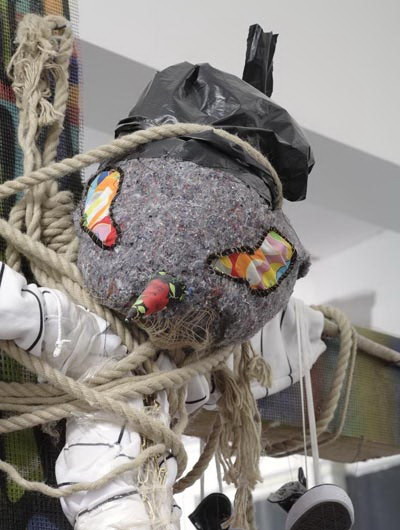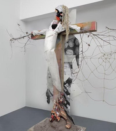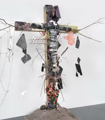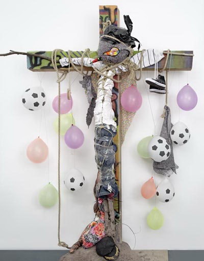 以上是阿加特一件作品有些抽象的诠释。比起泡在工作室不断练习,阿加特更喜欢用生活的方式来接近艺术。受到个人处境、旅行、时政、反文化的影响,然后再在上面做上自己的印记,她经常使用在街道上找到的物品来重新布置她的雕塑,结果就搞得像令人精神兴奋的社会新纪念碑。在作品《Three(Cross With Balloons)》里,她做的十字架上的漫画人物形象看上去很疲惫。头装在泥里,上面套了个黑色塑料袋,还用绳索整个拴住,她的“牺牲者”就像一个罪犯,在公共场合被人嘲笑着。