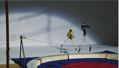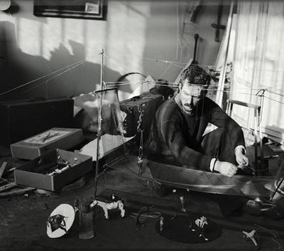 但这些好玩而简单的物件并没有显示出他有什么庞大野心,艺术家用这些小东西表演,给大洋两岸艺术圈的很多人带来了乐趣。在他的工作室和私宅内,在主顾们的邀请下,在他个人的坚持下,这些表演一遍遍地进行,随着时间的推移,表演逐渐提升发展。艺术家们非常喜欢看,当时,巴黎艺术界很多亮闪闪的人物都观看了这些表演。表演也引起了社会的关注。1929,《纽约客》宣布,表演可以通过萨克斯第五大道的Junior League娱乐中心编排演出。这么些年来,美国社会生活的构成早已发生了深深的变化,很难想象类似的活动发生在今天会是什么样子,有一点要说的是,对于他如何操作这些游戏,我们了解的越多,他那身着法兰西绒衬衫、乐呵呵的外省人样子就变得越复杂起来。从惠特尼展览中的一部影片里,我们可以看到,上了岁数的卡尔德表演他的马戏团,观众席上不时传来愉快的笑声,他让他创作的所有人物在台上活动,自己就好像一个巨人一样,也好像一个不太正常的上帝,在统治着他的小王国。