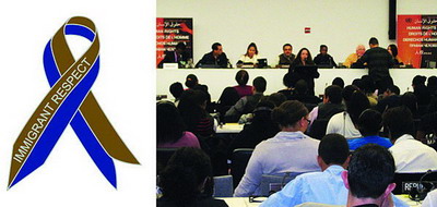 左:塔尼亚·布鲁古拉,尊重移民运动意识丝带,2011。 右:移民宣言的第一次公开阅读在联合国人权学生会议,2011年12月2日。