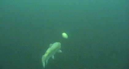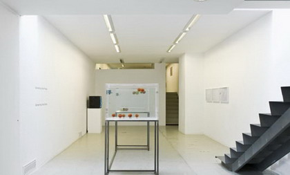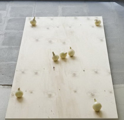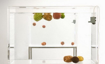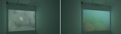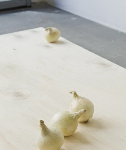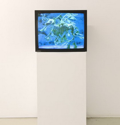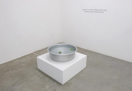 在2012年5月于NoguerasBlanchard画廊举办的个展“Leaves Swim”中,岛袋道浩(Shimabuku)展出来他最近的影像作品“Leaves Swim”(2011)及两件装置作品“Onion Orion”(2008)、“Something that Floats / Something that Sinks”(2008)。这场展览描绘了暗示性的魅力以及诗意。作品“Something that Floats / Something that Sinks”被布置在了展厅中央。通过对漂浮起来的水果与沉下去的水果进行的比较,这件作品揭示了岛袋道浩(Shimabuku)对日常生活物品蕴含的诗意以及内在于最平常的状态之中的奇异性的兴趣。用岛袋道浩(Shimabuku)自己的话来说,“有的西红柿浮起来了,有的却沉下去了。有的蔬菜浮起来了,有的却沉下去了。这是我在做饭时总是会注意到的事情,我总觉得它们充满了神秘感。因此我决定创作一件关于这种神秘感的作品——我保持了它们的神秘感,让观众能够‘原滋原味’地进行体验。”岛袋道浩(Shimabuku)总是会创作一些与食物或是烹饪有关的作品。对这位艺术家来说,艺术和烹饪都与看起来互不相关的成分进行意想不到地组合以产生某种可口或是赏心悦目的事物有关。正如之前所说的那样,人类、野生动植物或是现成物品之间的邂逅贯穿了岛袋道浩(Shimabuku)的整个艺术实践。作品“Onion Orion”同样强调了一个诗意联想的组合:它的灵感来自于词语“洋葱(onion)”与“猎户星座(Orion)”的相似性。这件利用洋葱制作完成的作品在展厅入口处勾勒出了猎户座里星体的排列情况。而展览同名作品“Leaves Swim”则呈现了在水下拍摄的一头海马的华丽影像,为观众呈现了一个充满了“异国风情”的场景——岛袋道浩(Shimabuku)的这件作品鼓励我们能够简单地去欣赏这种生物的美丽——这实际上是它在漂游的藻类中天然的掩饰工具。通过这一仍在进行中的艺术实践,岛袋道浩(Shimabuku)有趣地挑战了我们对界定不熟悉的事物的欲望,暗示艺术为接受这些不可思议的东西、欣赏未知事物的美丽提供了空间。