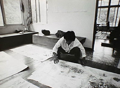 「我在台北近郊新店花园新城工作室制作『我的生活 我的情绪 我的感觉』画作的情景,这件作品参加1986年的新展望展。」 李铭盛1985年拍摄