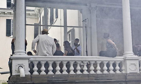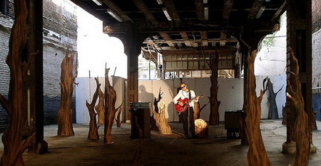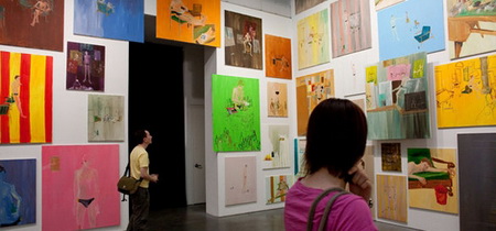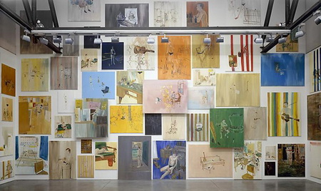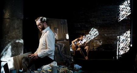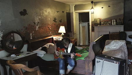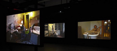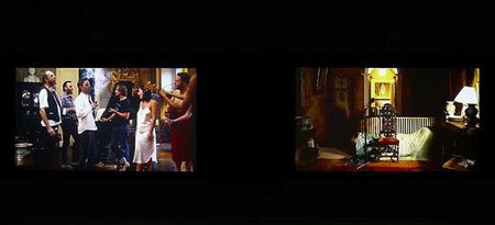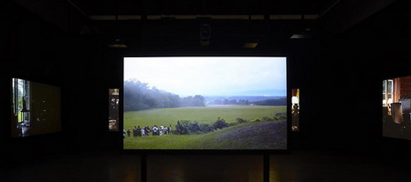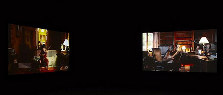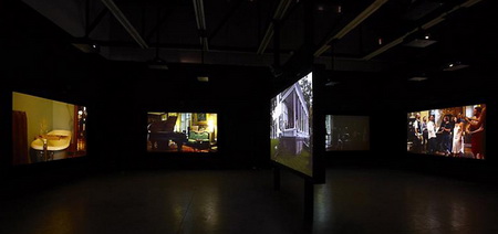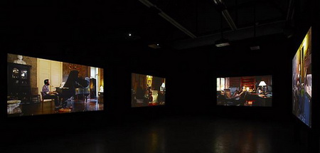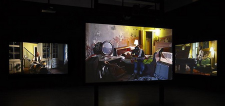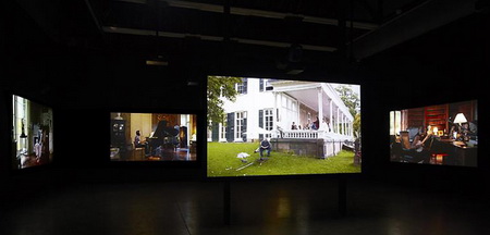 今年3月份,拉格纳·基亚尔坦松(Ragnar Kjartansson)的影像装置“The Visitors”在Luhring Augustine画廊展出。它由九张屏幕组成,每一张都装有独立的扬声器,并且被布置在两个略有些不起眼的位置。其中八张屏幕分别呈现了一位音乐人的画面——比如吉他手、班卓琴琴师、大提琴演奏家等等——而另一张屏幕则呈现了一间大房子的一条走廊的场景,乐器演奏家、歌手等各种各样的人物都在走廊里聚集。拍摄“The Visitors”的大宅位于位于哈德逊山谷,它在拉格纳·基亚尔坦松(Ragnar Kjartansson)之前的作品里就曾“出过镜”:比如创作于2007年的“Blossoming Trees Performance”,记录了拉格纳·基亚尔坦松(Ragnar Kjartansson)在这间房子里“扮演”一位风景画师而度过的两天。对观众耐心的“考验”仅仅是拉格纳·基亚尔坦松(Ragnar Kjartansson)的创作策略的一个方面。通过扩张那些临时事物,他同时还尝试着重新组织我们对叙述的感觉。“The Visitors”长达64分钟,记录了众音乐人对同一支曲子的演奏。在观看作品20分钟之后,观众要么会加入到这种体验中,要么就会变得烦躁然后离开。如果你留下来继续观看,那么你会发现除了那些唱歌和弹奏需要的动作之外,每一位音乐人在演奏过程中几乎都保持不动,而很快你就会意识到哪怕是他们最细微的动作、来自他们内心的最轻微的变化。每一张屏幕都呈现了一个精心设计的生动的场面:雕塑、绘画、印花织物以及家庭氛围浓郁的小摆设结合在一起形成了一个如画的场景。场景的安静、演奏歌曲如挽歌一般的节奏以及它不断重复的歌词将人们的注意力集中到了典型的隐性、不引人注意的部分——演奏者之间的视觉空间,唱出来的歌词与乐器声之间的听觉空间。而作为观众,我们发现自己也置身于其中而不仅仅是置身于一场表演里了。随着我们作为观看者的状态逐渐被侵蚀,我们会发现自己不再是普通的观众——我们成了游客。