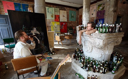 2009年,拉格纳·基亚尔坦松(Ragnar Kjartansson)带着作品“The End – Venice”参加了第53届威尼斯双年展,并且成为了最年轻的、代表冰岛参加威尼斯双年展的艺术家。这件作品与他之后的大部分作品相似,都试图表现出既有趣而又令人振奋、既狡猾而又诚实的状态。这件持续了整整六个月的表演作品呈现了这位艺术家与他的模特的生动画面:作品在Palazzo Michiel dal Brusà进行,它是临近里亚尔托、位于大运河上的一座14世纪的豪华宫殿;拉格纳·基亚尔坦松(Ragnar Kjartansson)将整个宫殿改造成了一间临时的工作室,每天都以大运河为背景为他摆着各种不同姿势的年轻模特画下肖像画。这名模特是拉格纳·基亚尔坦松(Ragnar Kjartansson)同为艺术家的朋友Pall Haukur Bjornsson,他会抽烟、喝酒,并且只穿着一条泳裤。整个表演最后产生了144幅大小不一的肖像画,它们暗示了多样化的艺术时期,并且涉及到了各种各样的绘画风格。它们占据了一种介于自主与暗示之间的模糊的状态;而且尽管它们具备基础、古怪的能量,但它们仍然表现出了一种特定的缺失感——在知道这些画作在一个更大的艺术项目里所扮演的角色后,观众自然而然地会将其视为一个不可繁殖的整体中的材料碎片。这次表演折射了当代艺术自身的兴衰起伏——或前进后退,或摇摆不定;它有效地“表演”出了那些充满了不确定性、矛盾情绪和偶然性的情况,而这些情况对如今艺术品的创作与欣赏也带来了极大的影响。此外,这件作品还阐明了一种特定的、能够理解使拉格纳·基亚尔坦松(Ragnar Kjartansson)的艺术实践独树一帜的创意行为的方式,而这种方式起源于冰岛的历史和文化。正如拉格纳·基亚尔坦松(Ragnar Kjartansson)解释的那样:“你开车穿过冰岛,每一座山、每一座农场都有一个故事与之相联。这就是我的行为表演的真相。我不相信‘你必须获得作品才能拥有它’这样的说法。它应该是以故事的姿态存在的。”这些画作2010年时在纽约Luhring Augustine画廊展出。
