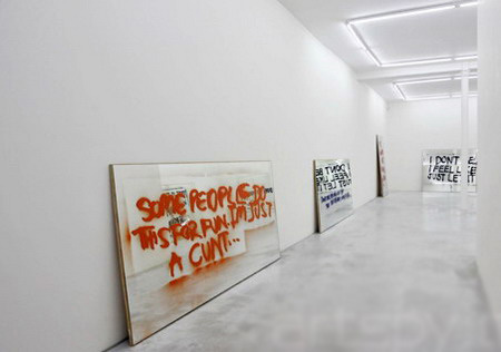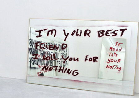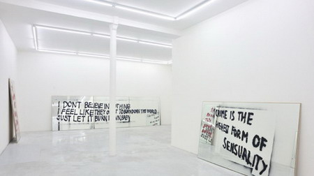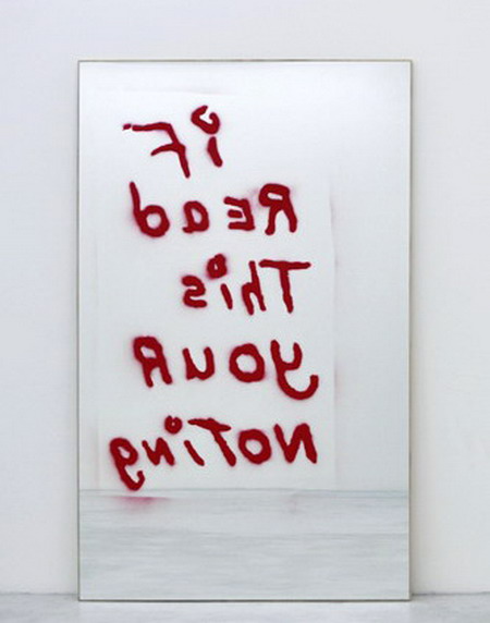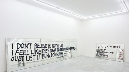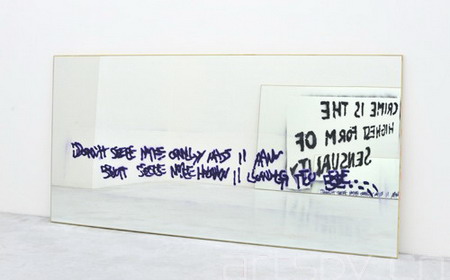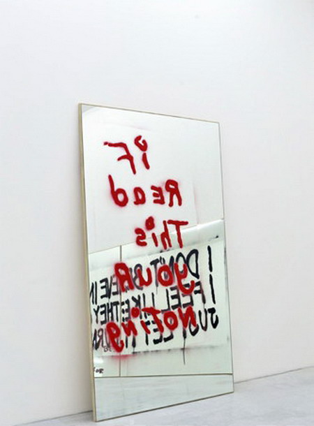 对镜子的运用符合了“mirror travels”,杜兰特随后在镜子上绘制了街头涂鸦。每一件作品都由一句用模板印刷在镜子上的涂鸦标语构成。尽管这些用于复制的模板来自不同的地点,经历了不同的时间,但它们仍然能作为对新自由主义运动全球领导权效果的回应被人们理解。