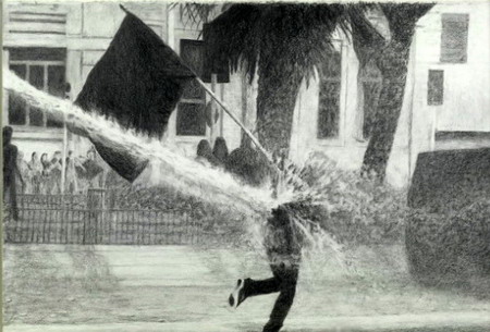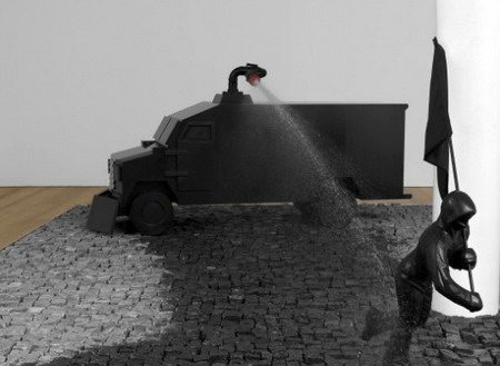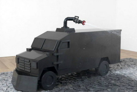 展厅的中心是黑色大理石的喷泉雕塑,它来源于一个公共空间内一个更大的装置原型,此作品的四周是一系列相关的石墨绘画。这个雕塑结构中设有一个高压水枪,水柱喷射而出,射向扛着一个无政府主义旗帜的蒙面人。其中包含的可争论性是Durant艺术的决定性因素。在无关的评论和尖刻的批评之间,它以“庄严”的公共石头塑像重塑了当代的国家权威的片段。图像中的两个反叛者是基于两则新闻的网络图片,展示了2011年和2012年的圣地亚哥起义(作品标题则暗指1917年杜尚的喷泉——典型的“现成品”)。