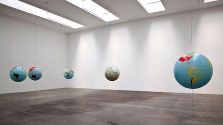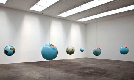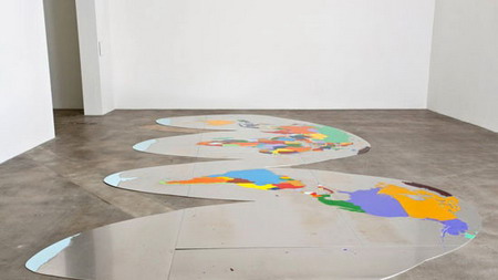在画廊某一间展厅的地板上,铺着一张足有24英尺长的铝制地图。这张地图被裁剪成地球表面等面积投影的形状,各大洲以及各个国家都用彩色的蜡纸加以了区分。这张地图是整个地球表面的真实写照,能够产生一种站在世界内部、向外观看整个地球表面的效果。