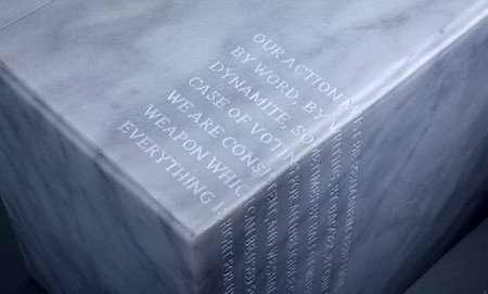展览现场有一个用来运输炸药的板条箱和一个装满了碳酸钙粉末的口袋——想象一条革命信息与前者之间的联相对简单,但要想让这种信息与后者产生相同的联系则要困难得多。碳酸钙粉末是处理大理石碎片时产生的,通常被用在跨国公司的大批量生产中;此外,它还被作为添加剂材料用在许多产业之中。而这里的口袋则代表了经济正在进行的典范的转型。技术的进步促进了大理石块的开凿,同时也增加了大理石的开采量。1868年时,卡拉拉的经济处于全盛时期,而工人运动也刚刚开启,材料的开采量达到了11.12万吨。2010年,块材的产量达到了98万吨,而其中只有24%的开采量。尽管这样,当地锯木厂、艺术工作室以及工艺车间的制造链仍然在精简,自然环境的破坏也变得越来越明显。以这种复杂的经济及文化现实为出发点,再加上卡拉拉在历史上是一个重要的无政府主义中心,杜兰特试图传达一种大理石产业的危机感,以及由卡拉拉无政府主义的工人实践的“行动宣传”这一主题。展览中的某些作品还保持着未完成的状态,这一选择具有某种特殊的意义,暗示了上世纪70年代时在都灵发生的某些事件。