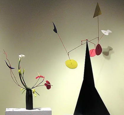 考尔德大多是运用铁丝、铁叶子,通过焊接的技术来架构一件艺术作品,把组成雕塑的各部件按照需要来涂成不同的颜色,雕塑随着气流的不同来展现本是稳固雕塑存在的不同面貌。如果说气流在考尔德的作品中是“动”的推动力,那么各部件的不同颜色也就成了他作品的动态感。这样的一类题材形象我们见得比较多,如《铝叶子》《红花瓣》等。