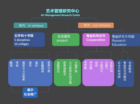 艺术管理、艺术教育和艺术鉴藏三个系除了教学的主体之外都设有相对应的研究中心和研究所,是作为对标准艺术教育学科建构的良好补充。研究中心或研究所在对待学科建构、学院建制、社会课题及科研研究上具有更为灵活多样的性质,这正是国美艺术管理与教育学院在其课程及内容设置上的创新性调整。